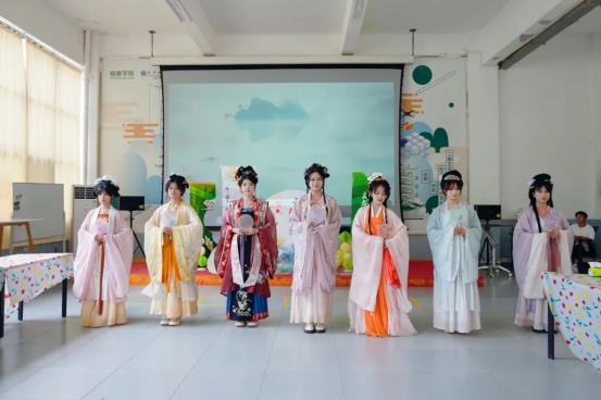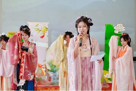 活动在一场汉服走秀展示中拉开序幕,一段别开生面的唐代宫廷乐舞《霓裳羽衣曲》引起教职工们的阵阵掌声......在诗词抢答趣味互动环节中,老师们争先恐后积极抢答关于“端午节”的典故和常识。传统民俗活动“投壶”也颇得大家喜爱,参与活动的老师们纷纷拿着箭矢往壶里投射,感受古代竞赛的乐趣。