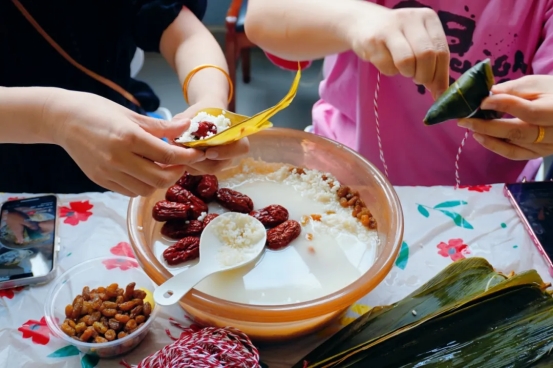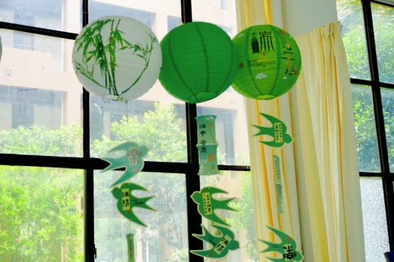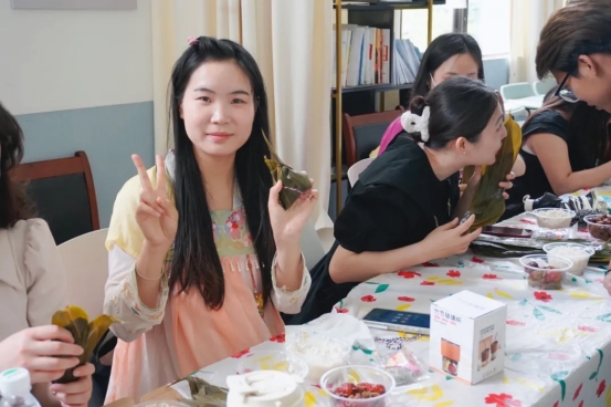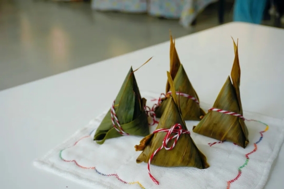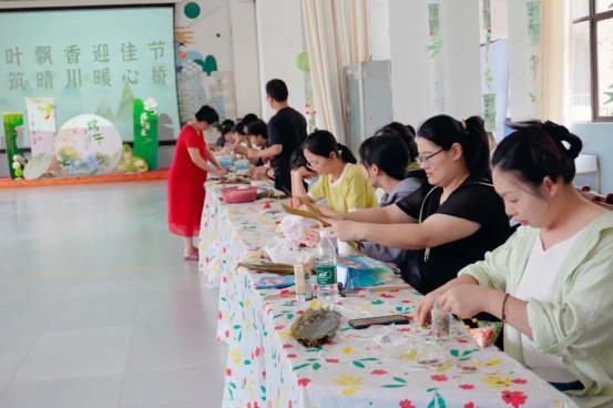 到了包粽子环节,大家各展所长、分工合作,将粽叶挽成漏斗状,填上糯米、蜜枣、馅料,先扎绳,再封口捆扎,巧手翻飞,将节日的祝福包裹进一个个饱满可爱的粽子中。一会功夫,三角的、四角的、长条的,各种形状的粽子就在老师们的互相交流中摆上了桌。在此过程中,大家一边互相交流包粽子的手法和技巧,一边唠家常,现场欢声笑语,洋溢着节日的浓厚氛围。